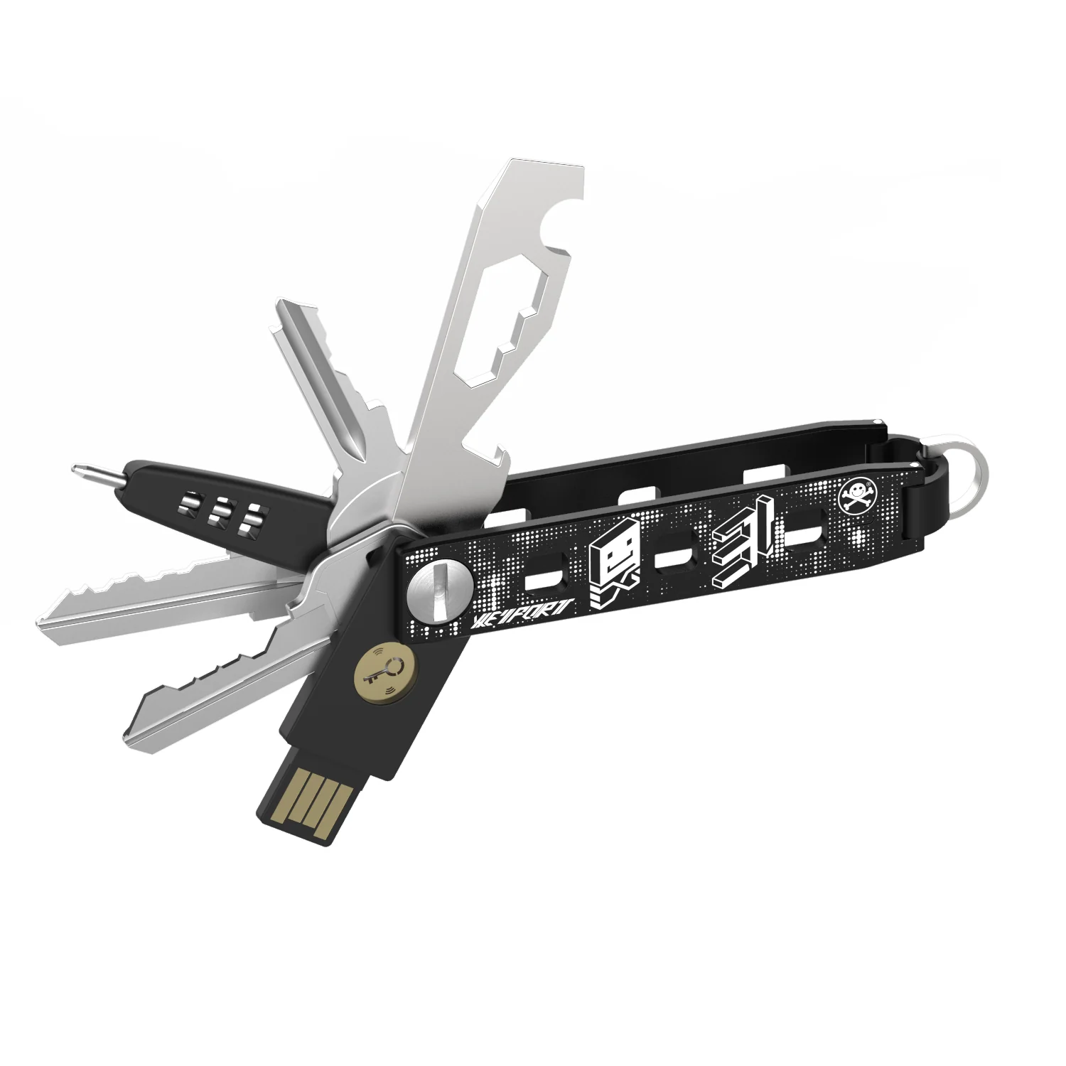 The aluminum Keyport Pivot 2.0 is a modular multi-tool + key organizer keychain that holds up to *eight keys and/or tool inserts (USB Flash Drive, MOCA 10-in-1 Multi-Tool, RuSH Multi-Purpose Tool, Yubikey, Pen, etc.). You can also attach our optional tool/tech modules (OmniFob Mini-Flashlight, Pocket Flare Flashlight, NEBA Module, and WeeLINK Charger Cable) to both sides of the Pivot's aluminum chassis.
