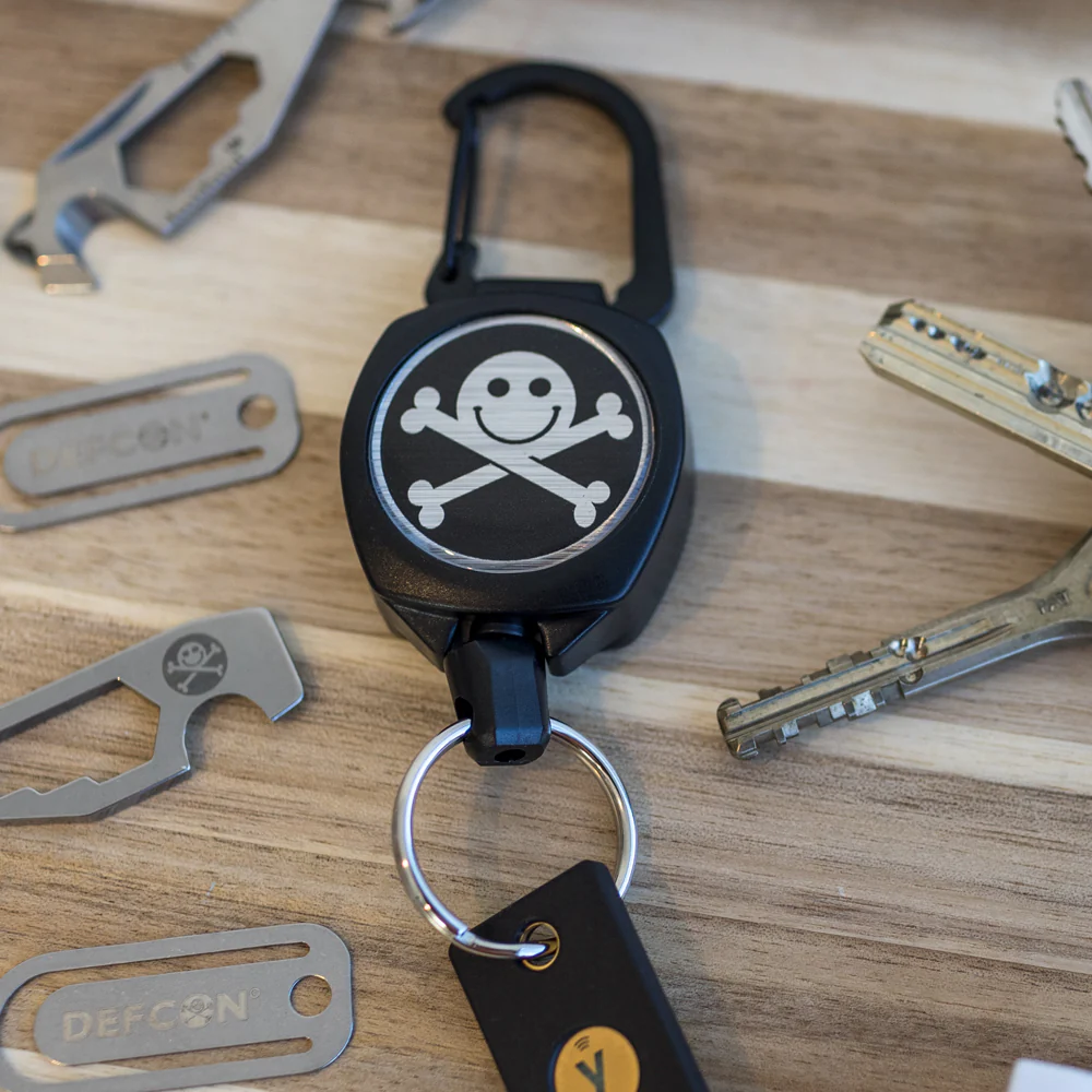 The DEF CON Jack Sidekick Retractable Keychain & Badge Mini-Reel is small but mighty and capable of holding up to 6+ keys or a Keyport key organizer and a badge giving you easy access whenever you need it. Built in the USA with globally sourced materials, the Sidekick has a strong molded black polycarbonate case and a retractable cord made with DuPont™ Kevlar® fiber. Attach your Keyport or keychain and badge to the twist-free end fitting and secure the carabiner to your belt clip, backpack, work vest, or purse. When you need your keys, just pull them out; when you're done, let them go and the built-in tether retracts back into place until you need them again. When you're looking for an all-in-one everyday carry companion to secure your keys and badge, the Sidekick is your best option.