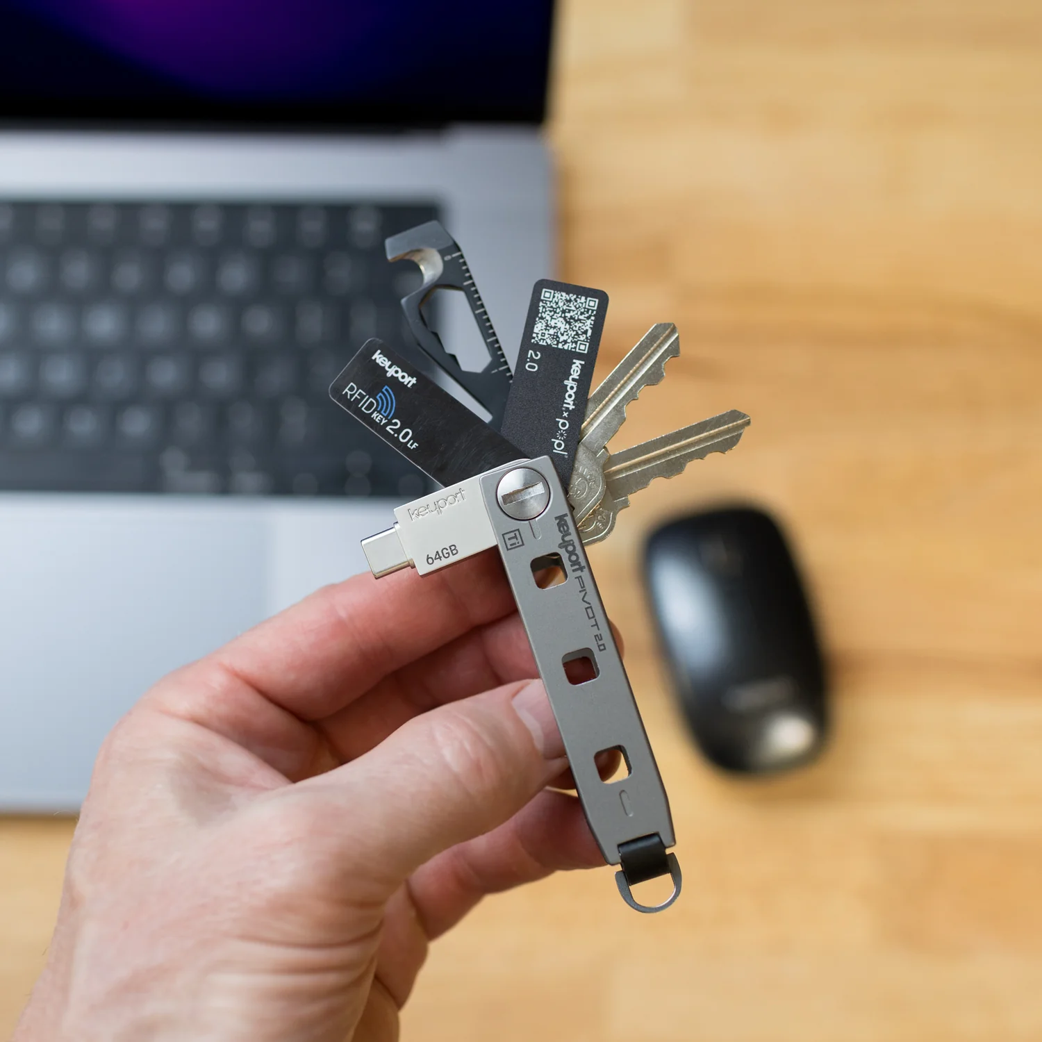 Make bulky thumb drives obsolete. The Keyport USB-C 3.0 Flash Drive Insert delivers true USB-C flash drive performance - up to 5 Gbps - packed into a palm-sized form factor that slots into your Keyport Pivot or clips onto any keychain. Perfect for photographers, road warriors, and on-the-go professionals who need secure, always-with-you storage on Mac and Windows systems.